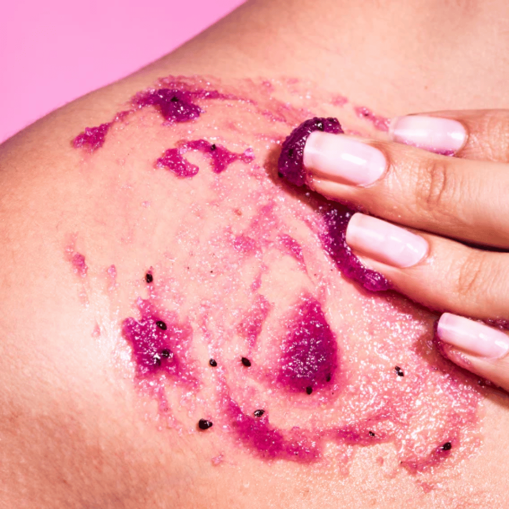 An exfoliating body scrub formulated with Sea Salts, Sugar, Blackcurrant Seeds, Blackcurrant Oil and Peach Kernel Oil.